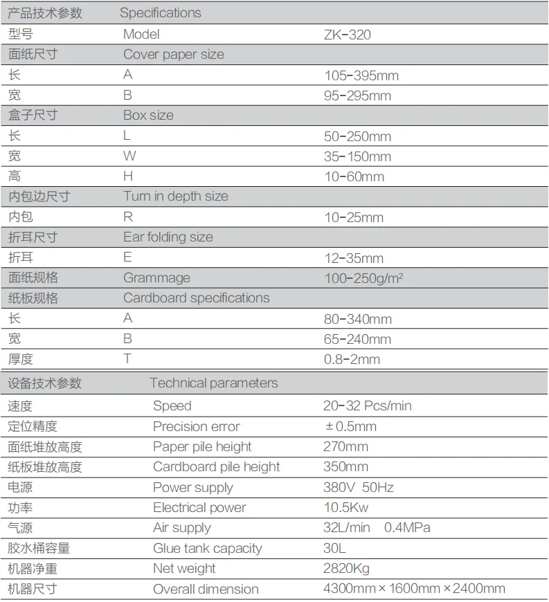 ZK-320硬盒制造机采用伺服控制系统、可编程PLC控制系统、光电伺服定位系统和人机界面控制系统,实现自动上纸、粘合和内盒纸板的精准定位,无需粘贴四个角。一次性完成折耳和折入成型,满足市场对小批量高端品质盒子的需求,如珠宝盒、纪念品盒、糖果盒等。
