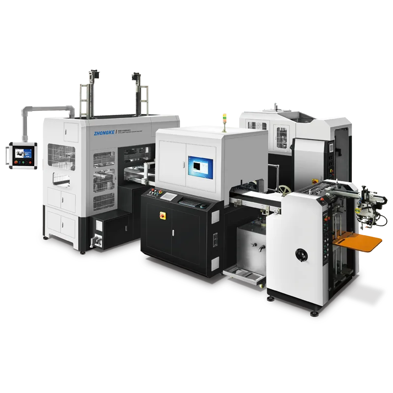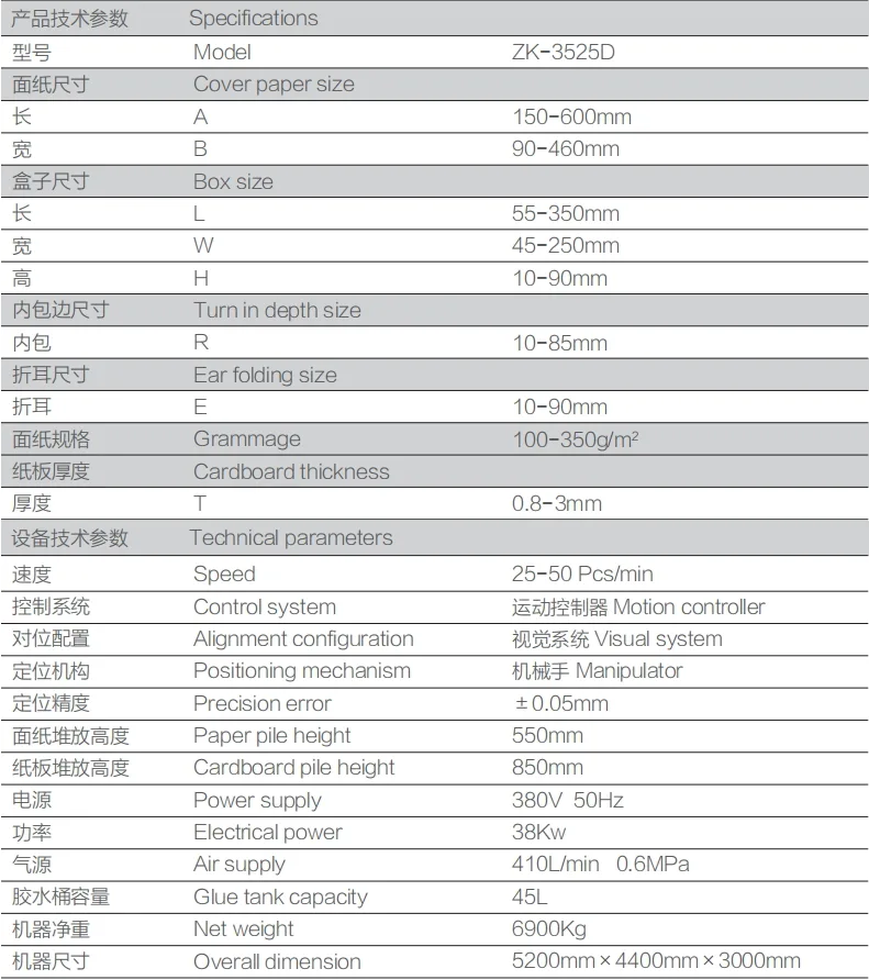 ZK-3525D硬盒制造机采用双工位成型机制、伺服控制系统、可编程运动控制器、高像素视觉+机器人定位系统以及人机界面智能系统。这些技术实现了智能操作、数字调整和参数化设置,确保了机器的高定位精度、规格调整便捷、操作更加稳定和平稳运行。自动上纸、涂胶、四角封边、喂料、边缘覆盖、全耳折叠及成型等过程一气呵成。双工位机制大大提高了生产效率,生产速度可达到每分钟50个,是生产大批量高端硬盒的理想设备,广泛应用于电子产品包装、手机盒、珠宝盒、化妆品盒、手表盒等领域。