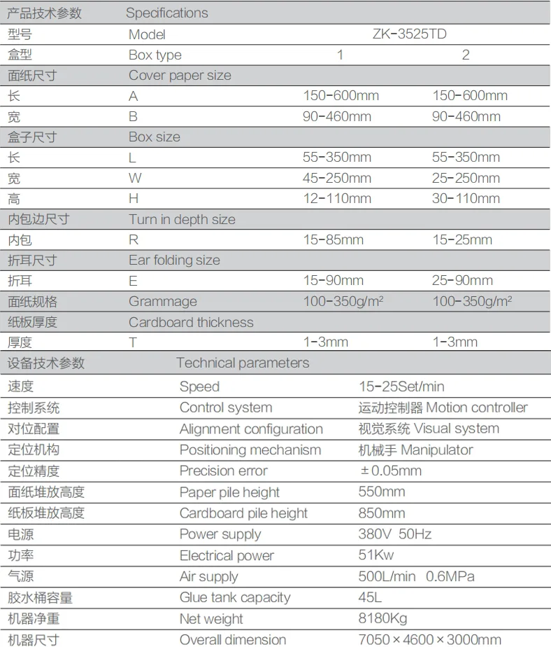 6. 自动化流程: 包括自动进料、胶合、四角粘合、定位、包边、全耳折叠、成型及箱体成型等,所有操作一次完成。