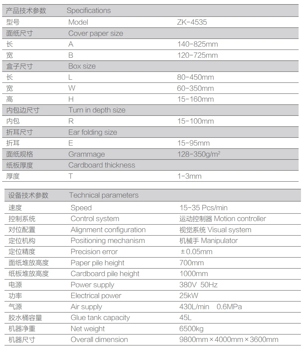 本机采用伺服控制系统、可编程运动控制器系统、高像素视觉+机器人定位系统、人机界面整机智能化系统,实现智能化操作功能,数字化调节方式和参数化功能设置。实现机器的定位精度高、更换规格易调节、运行更稳定、动作更流畅,直线进盒结构设计使制盒速度更高效。纸盒自动送面纸、上胶、定位贴合、引取、裱盒、包边、全折耳和折入成型动作一次性完成的特点。使用于高档精品天地盖纸盒生产,如电子产品包装盒、手机盒、首饰盒、化妆品盒、手表盒、书型盒等。