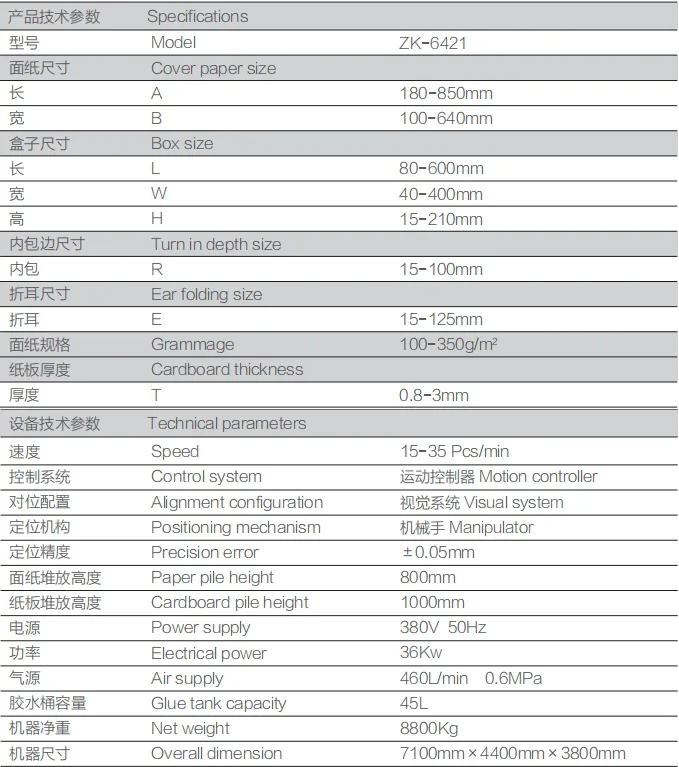 ZK-6421 机器采用伺服控制系统、可编程运动控制器、高像素视觉、机器人定位系统以及人机界面智能系统,实现智能操作、数字调节和参数化设置。通过自动调节盒子高度和伺服线性导轨调节,确保高精度定位、稳定操作和顺畅运动,同时简化规格更换。机器一体化完成纸张送料、上胶、四角贴角、包边、全耳折叠以及成型定型等工序。