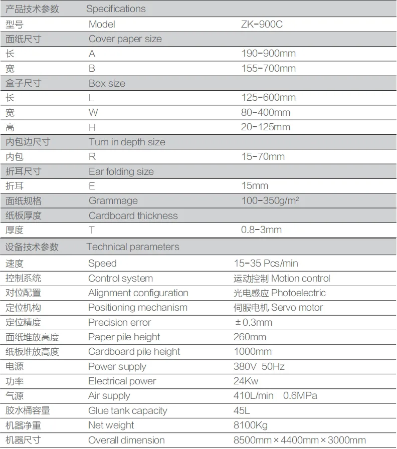 ZK-900C刚性盒子制造机采用伺服控制系统、可编程PLC程序控制系统、光电伺服定位系统和人机界面控制系统。该机器能够一步完成自动上纸、涂胶、定位、包边、全折耳和折入成型等工序,满足高端刚性盒子的要求。适用于生产奢侈品包装盒,如礼品盒、化妆品盒、花卉盒和睡衣盒等。